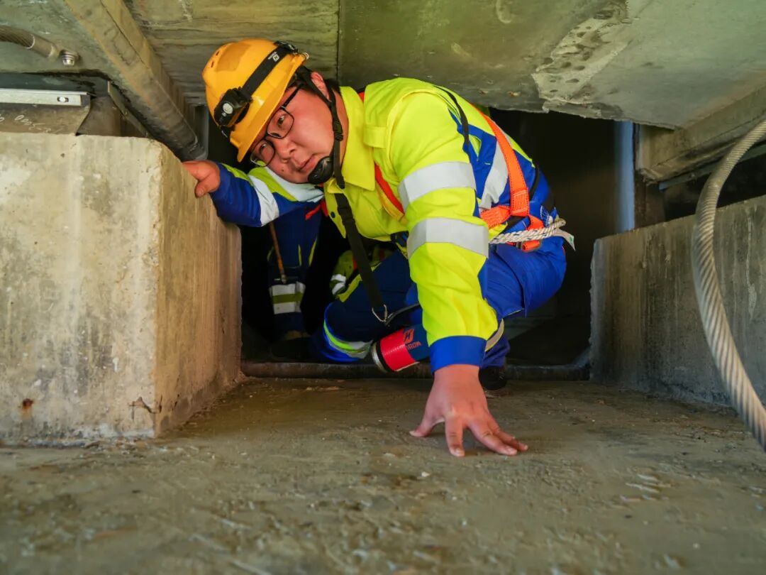 第两个检查和的是公路桥轮轴,轮轴是连接公路桥体和桥身的重要部件,也是贯穿和分散桥载重与变形的关键内部结构,位于分块和桥身的中间位置,工作台空间十分狭窄,车翰不得弓腰检查和。