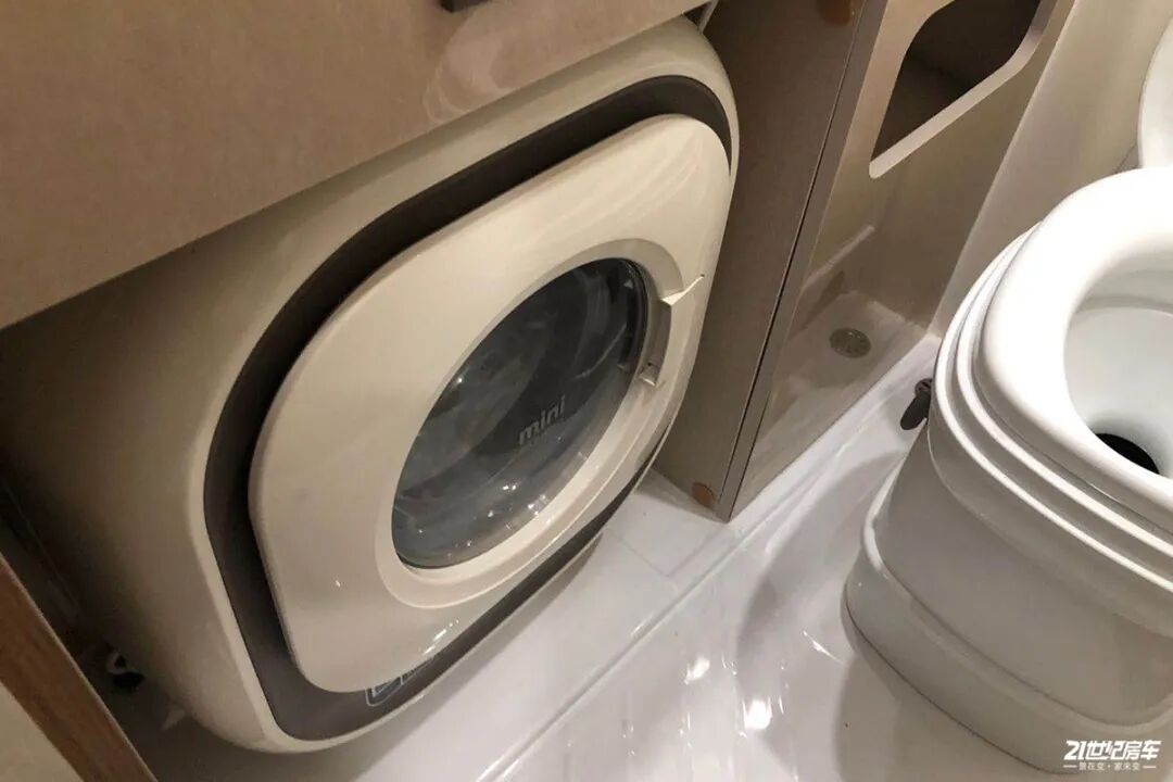 洗脸池下方配有3kg滚筒洗衣机,在房车生活中也可以非常轻松的洗衣服。
