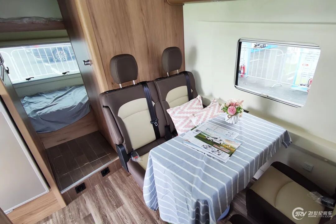 驾驶室上方额头双人床的设计,可通过室内爬梯上下往返,能满足两名乘员休息;顶部及两侧配有外推窗,保证了充足的采光及空气流通性;休闲会客区采用对座式汽车座椅造型设计,搭配可升降式餐桌,临时可拼成一张床;沙发内侧墙壁上有外推窗,推窗上方有储物柜,方便日常使用。