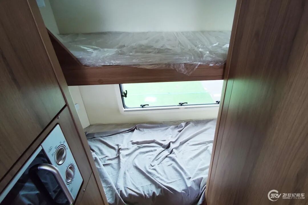 车尾部分是RV90 C豪华版和豪华后拓版本的最大区别所在,实拍车型为无拓展版,配备的是上下铺单人床,而后豪华后拓版本则是可拓展的双人床布局水路方面,净水箱容积为160升、灰水箱容积为120升能源辅助设备可选配400W太阳能电池板。