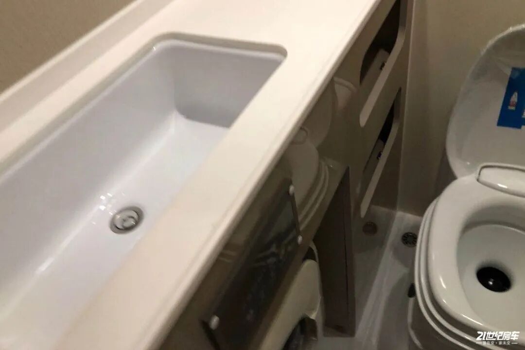 卫生间位于车辆尾部,内部配有电动粉碎式马桶、洗脸池、抽拉式水龙头、洗衣机、纸巾盒等。卫生间地板采用防滑设计,防止洗澡时滑倒。
