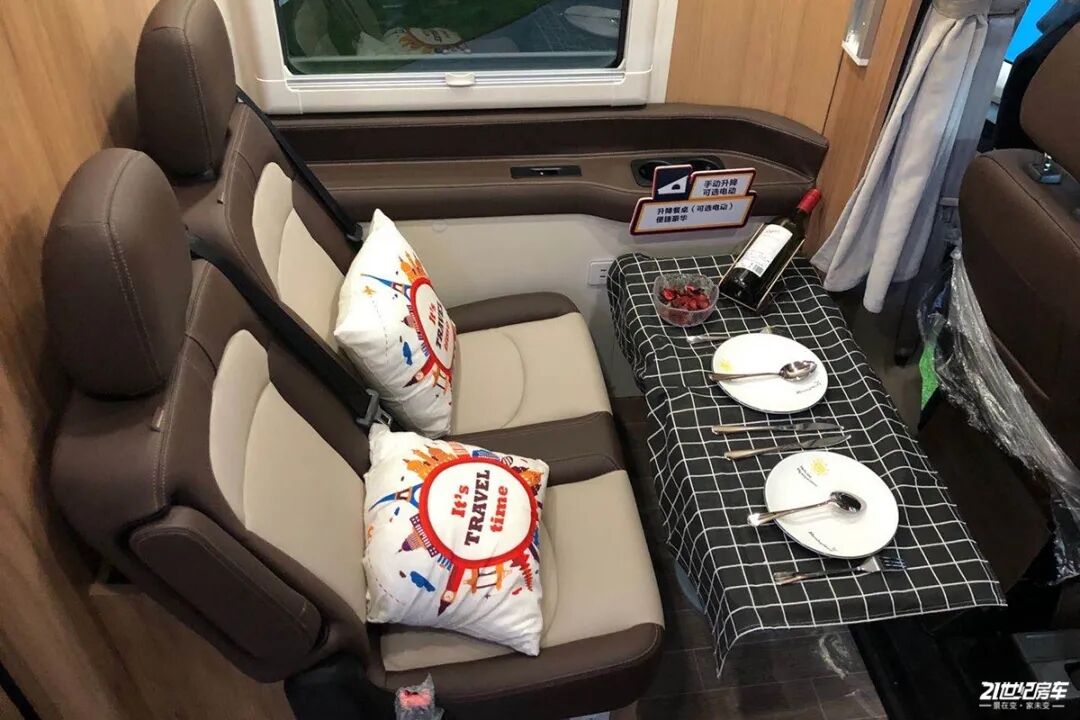 车内提供胡桃木和白蜡木两个内饰风格,用户和根据自身需求选择休闲会客区采用单排双人汽车座椅造型+独立座椅设计,搭配一张可升降餐桌;周围还配有杯槽、双孔插座及USB充电接口,可及时为手机及小型电器充电;沙发内侧墙壁上有外推窗,推窗上方配有吊柜,方便日常使用。