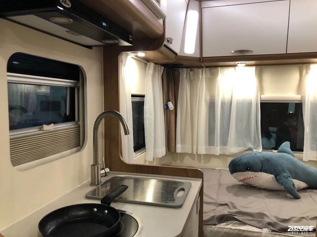 厨房区位于卫生间对侧,乘客门后方,配有房车专用抽油烟机(抽油烟机为选装)、电磁炉、洗菜池、进口多美达80L房车专用冰箱、储物柜等。