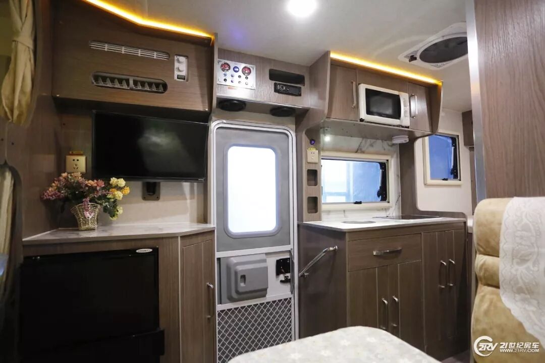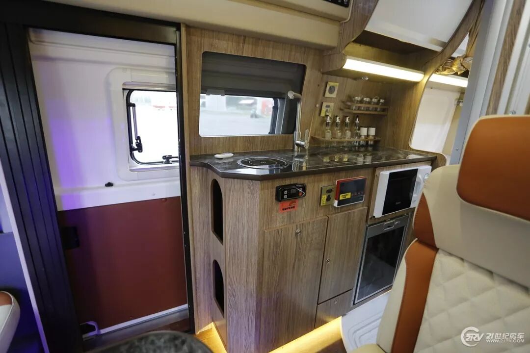 新后备箱部也配备有完善的厨房区,集成式旅行车专用灶具带有洗菜池及燃气灶,灶具带有盖板,不使用时可保持桌面平整美观。