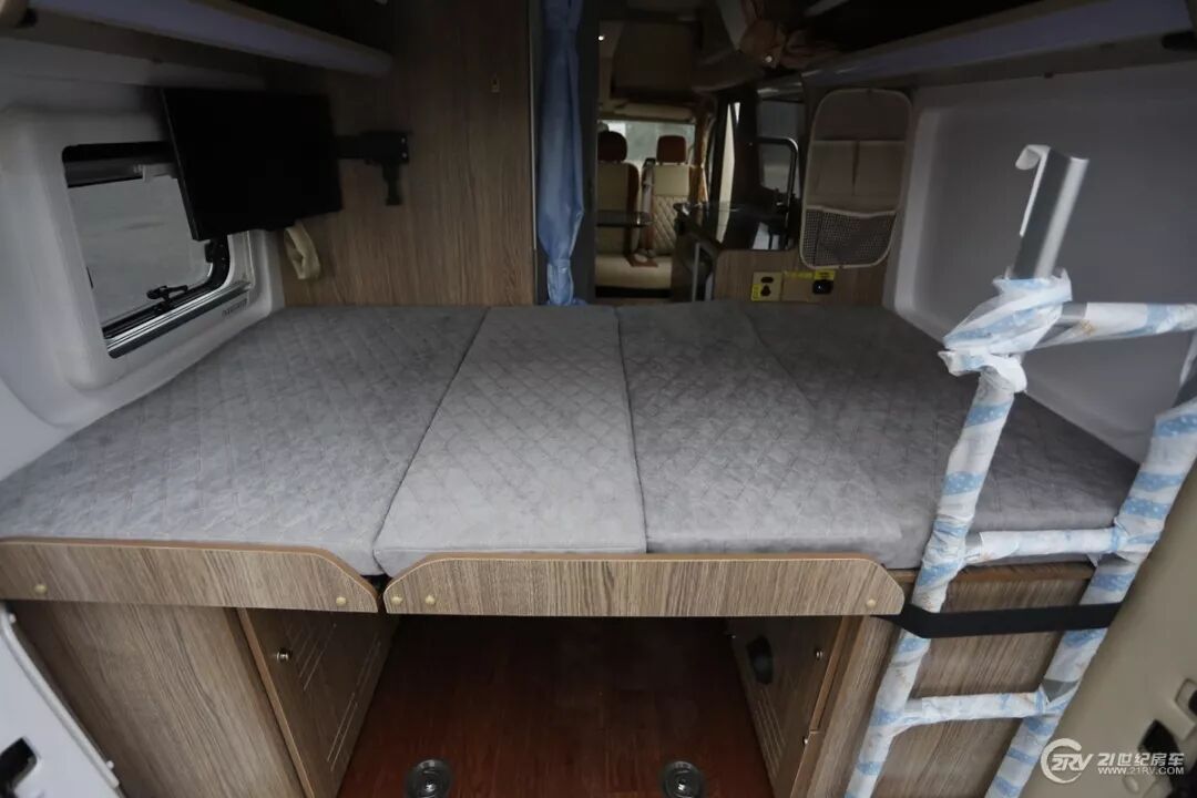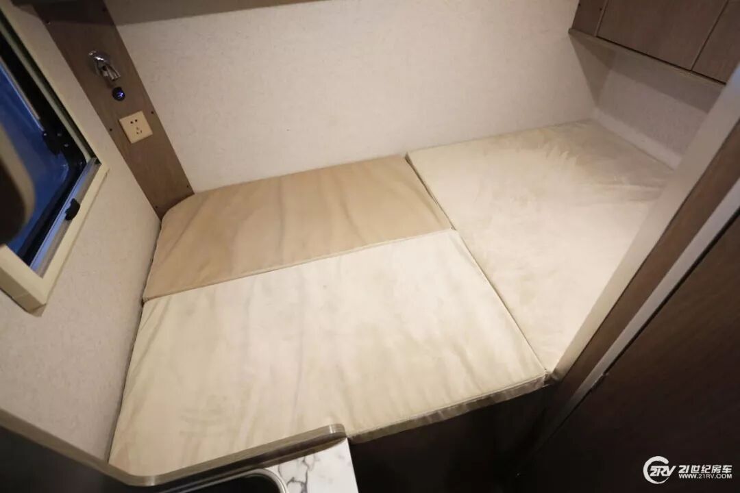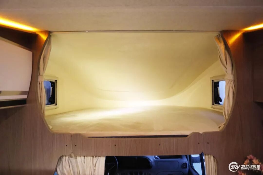 在没有增设拓展舱的情况下,室内的活动内部空间表现不错车尾是一张1200×2200(mm)的双人大床,床头床尾均有开设窗口,以保证室内的空气流通和采光双人床垂直方向是一组U型吊柜,家用变频空调嵌入在吊柜内侧,因此并不影响总体的美观度。