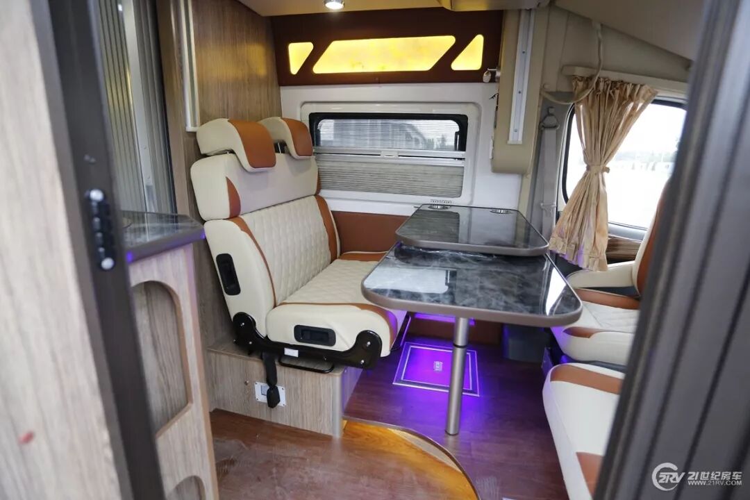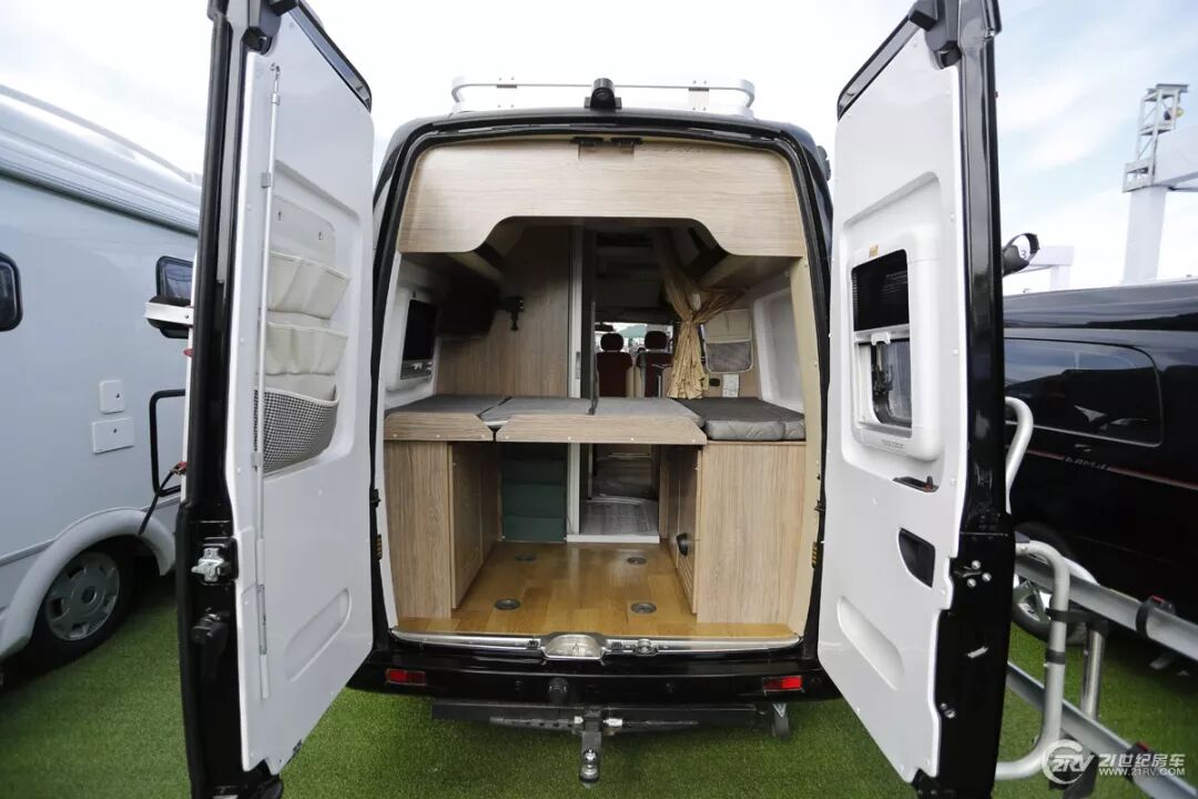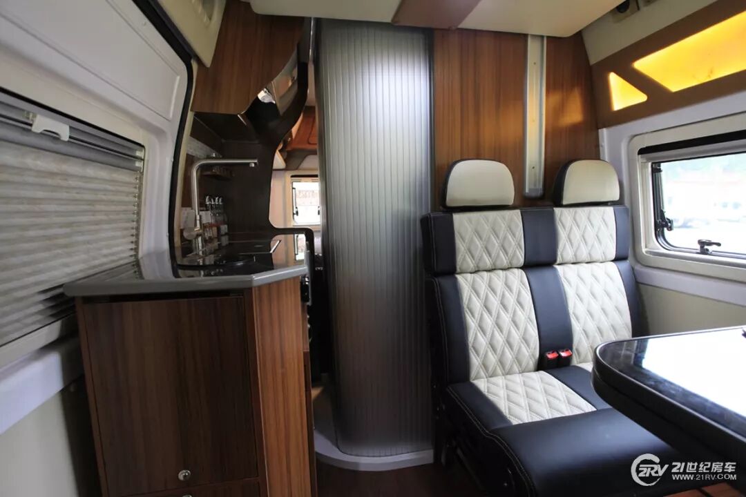 内饰布局方面,这款顺旅S800车型不仅外观时尚运动,内部布局及颜色配搭也一改国内大通B型旅行车的千篇一律结构设计,后备箱红橡木家具与米白色皮革混搭营造了干练、简洁的居家风格整后备箱部布局为单排卡座+主副驾驶座椅旋转+总体式厨房+卫生间+尾部折叠双人床+中部电动升降床。