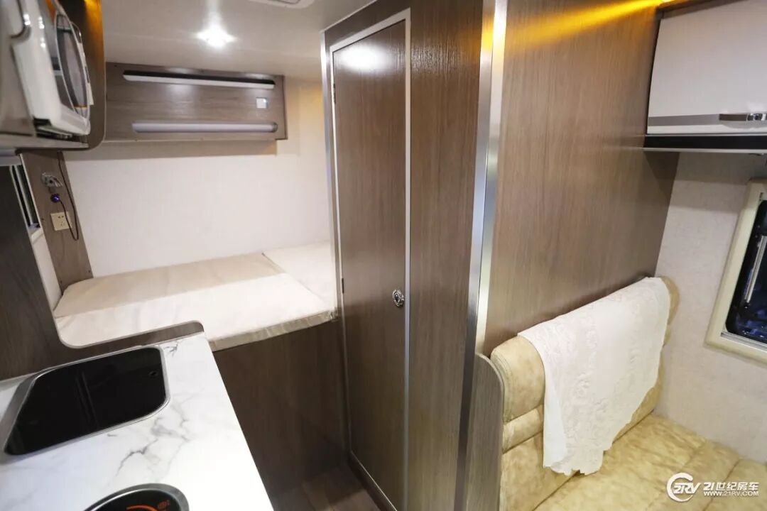 厨房区位于乘客门后方,配置上处于常规水平,桌面上有带白色玻璃盖板的洗菜池及电磁炉,另外从上图可以看出厨房区的储物内部空间也较为丰富。
