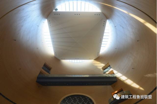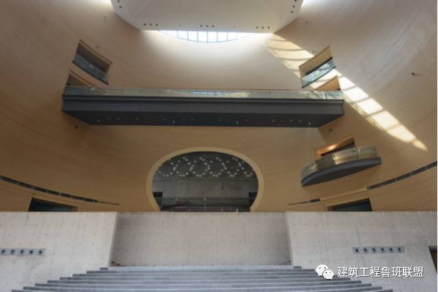 特征6:五个圆筒形舒适度纵横交贯,装饰材料规格尺寸繁多,观众厅丧尸横截面木饰面构造复杂五个圆筒形相贯线为扭曲舒适度曲线,铝格栅饰面有347种规格尺寸,总量为57168根;观众厅侧墙及包厢采用波浪式圆弧形木饰面,实木条有82种规格尺寸,总量为23480根。