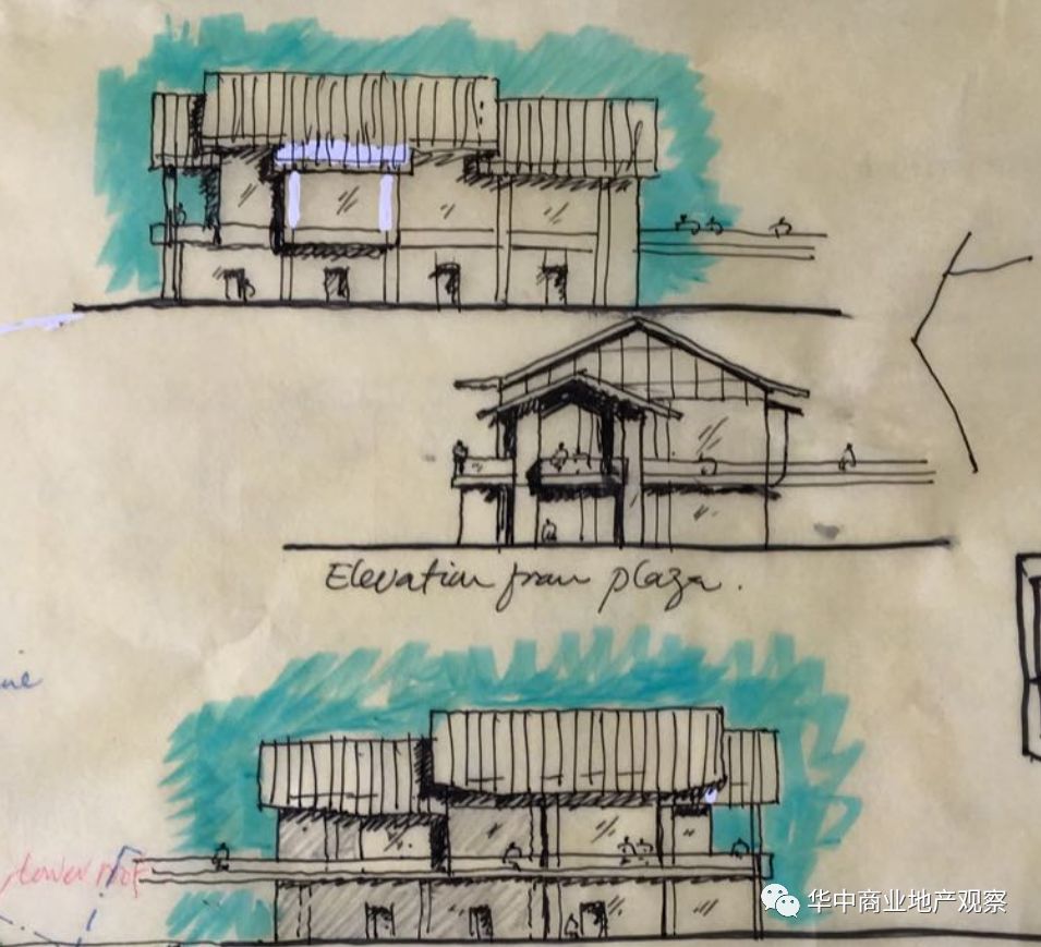 手绘单体建筑式样为了能够更好展青瓦示坡屋顶与玻璃立面的结合,这样的尝试在国内属于首次,成都太古里地面25栋独栋建筑,为了更好层高比列、屋顶形式、过道宽度,几乎每一栋经过十几次的手绘效果方能提上方案;开发节奏