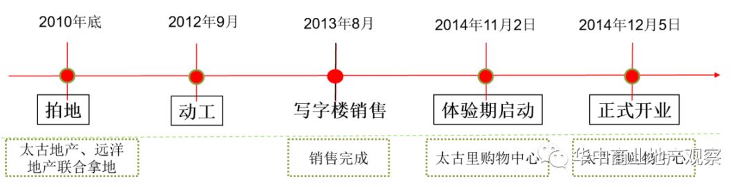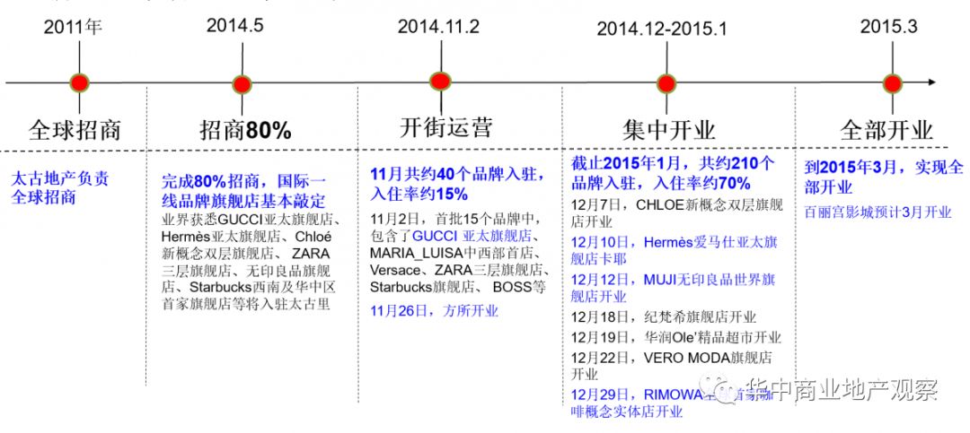 项目整体开业时间倒排项目从2008年就开始进行规划设计,历时7年时间,太古里购物中心于2014年11月2日开始试运营。项目写字楼部分2013年整体销售,博舍酒店和服务式公寓将于2015年开始运营;