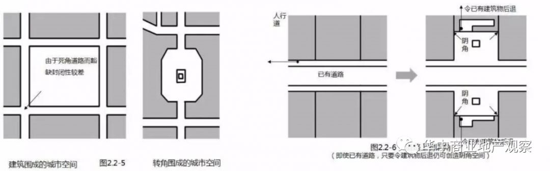 理论三:阴角理论:“阴角”系指其内侧凹进去的空间,“阳角”系指外侧突出的空间在外部空间中,阳角空间很容易创造,相对地,从建筑和道路的关系来说,阴角空间很难成立当沿着棋盘状道路布置建筑时,全都成了阳角空间,形成要把人挤出去似的非人性城市空间,相反,用阴角空间可以创造出一种把人拥抱在里面的温暖、完整的城市空间。