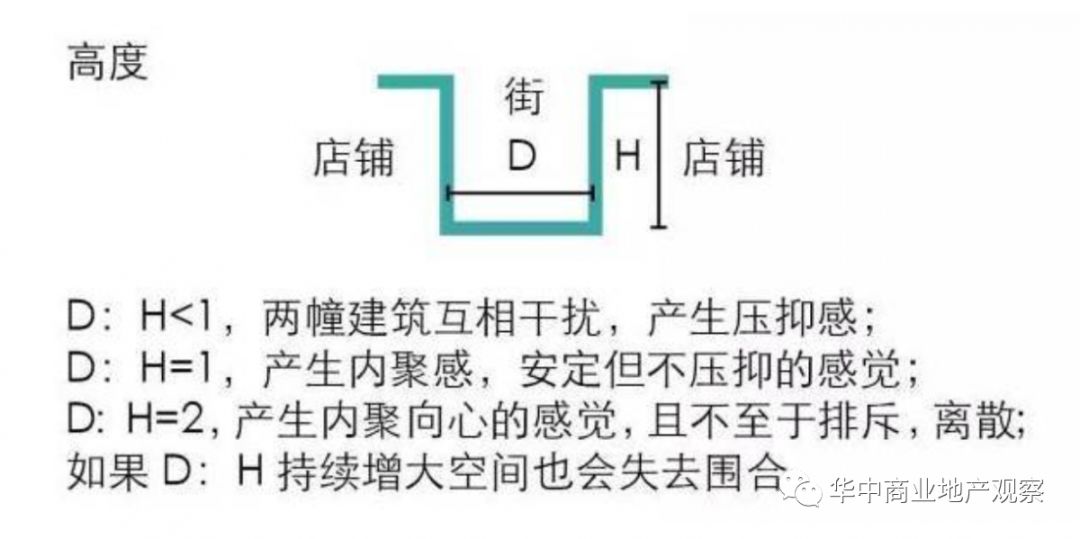 卢原信义在街道美学里提出的D/H=1:1是最佳的近人视角;广场和街心庭院空间:街区的广场和中心庭院是街区重要人流和后期活动的聚集点,庭院亦是连接地上地下重要的节点和通道,街区对于广场和庭院的利用是关乎项目是否能够达到舒适性很重要的组成;