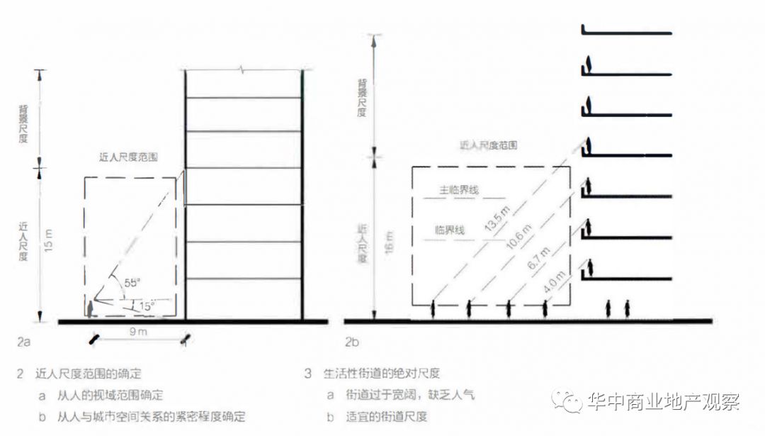 ”垂直方向上影响行人知觉感受的范围 , 将三维层面(如建筑立面等侧界面) 15 m以下的城市空间定义为近人尺度城市空间
