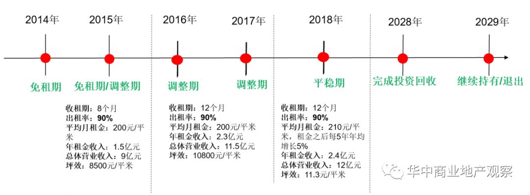 资金节奏安排根据推算,预计购物中心的总投资约30亿元,按照8%的投资回报率,平均出租率90%,约13年收回投资,预计平均每年的租金收入约2.4亿元,210元/平米.月(按建筑面积)、300元/平米.月(按营业面积)