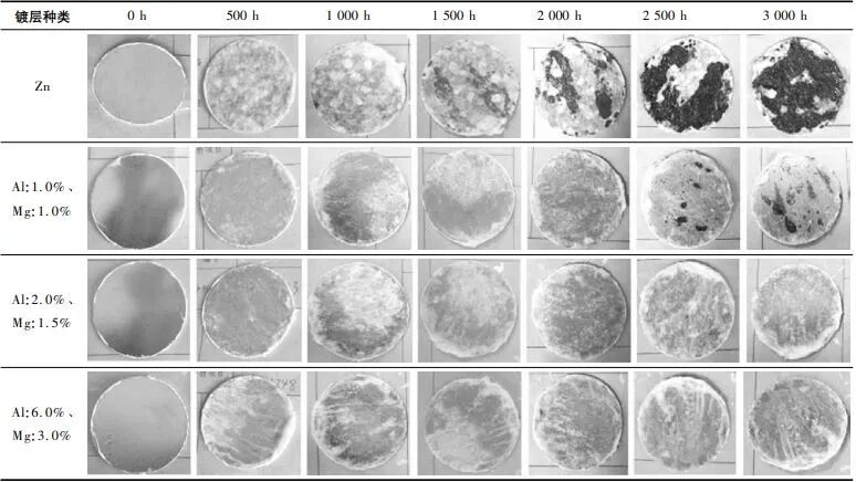 2.1.2优异的平面耐蚀性表7为纯锌GI、与不同成分体系的锌铝镁镀层中性盐雾试验结果Al含量2.0%、Mg含量1.5%的镀层组织,重量≥275g/m2可以满足3000h以上的中性盐雾试验,其同等重量的锌铝镁镀层循环盐雾试验周期也是锌镀层的5~7倍。