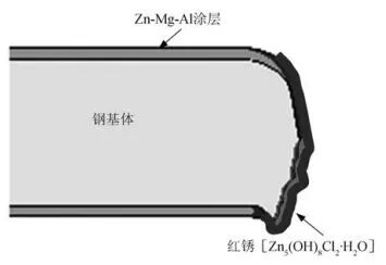 2.1.3优异的耐切口腐蚀性图1所示为Zn-Mg-Al镀层的切口腐蚀图可见,Zn-Mg-Al镀层的耐切边腐蚀性比普通GI板好,盐雾和循环腐蚀试验后,在Zn-Mg-Al镀层切边位置包覆一层致密的胶状腐蚀产物,其主要成分为Zn5(OH)8Cl2·H2O,该腐蚀产物非常稳定,不易分解。