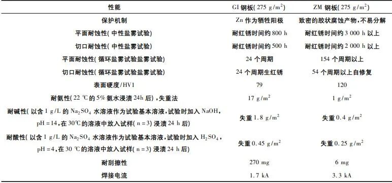表6锌铝镁钢板ZM与热镀纯锌板GI的性能