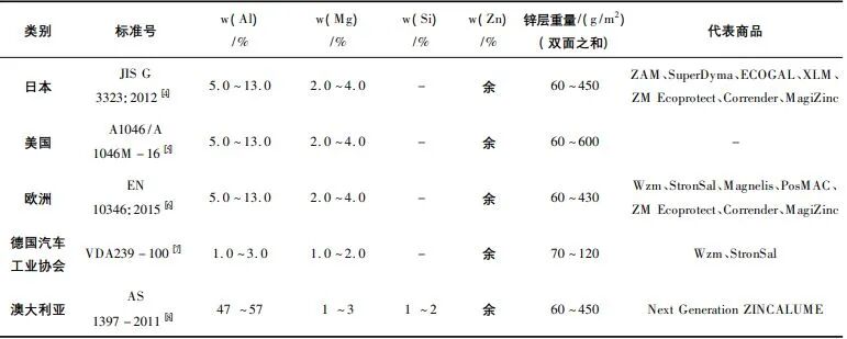 不同标准镀层的控制范围稍有不同,其中汽车用产品的镀层偏薄,采用较窄范围的铝镁成分控制,其它耐性要求高的应用一般都选择中铝和高铝成分体系表5列出了锌铝镁镀层产品的国外标准及满足标准的商业化产品表5锌铝镁镀层标准及满足标准的商业化产品