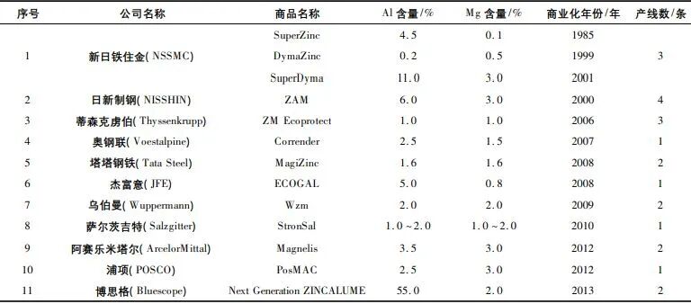 2013年澳大利亚博思格公司开发生产了高铝锌铝镁成分体系,并命名为“NextGenerationZINCALUME”,以建筑用钢为主表2为国外商业化的锌铝镁镀层产品及生产线其中,日新制钢、新日铁、浦项、阿赛乐米塔尔和科瑞钢板的锌铝镁成分体系以中铝成分体系为主,主要用于光热、光伏、畜牧和建筑用途,具备良好的耐蚀性;蒂森克虏伯、奥钢联、塔塔钢铁、乌伯曼、萨尔茨吉特以低铝成分体系为主,主要用于彩涂基板、家电和汽车高表面用途,产品实物质量较好,其中蒂森克虏伯产品表面质量达到O5标准,产品涵盖碳素结构钢、超深冲IF钢、高强低合金结构钢、双相钢、加磷高强钢和烘烤硬化钢,产品被大量用于欧宝汽车及其它车企的零部件;博思格以高铝成分体系为主,主要用于建筑用途。