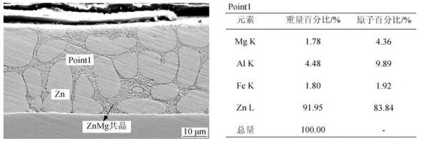 2.2锌铝镁镀层构造结合电镜组织照片和能谱分析,明确了低铝锌铝镁镀层由大块的初生Zn相及填充中间的Zn-Al-Mg共晶相组成,具体见图2。
