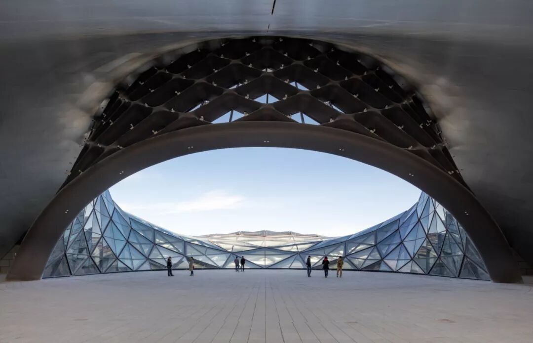 在外部,这座建筑表达了周围地区蜿蜒的景观其弯曲的表面由柔和的白色铝板构成,成为了一部由边角和表面,柔软和锐利构成的诗篇旅程从越过桥梁来到哈尔滨文化岛开始,起伏的建筑表面围合了一座巨大的公共广场在冬季的时节,融入了冬日的雪景之中。