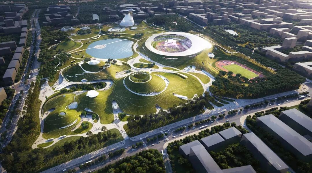 体育公园占地约70万平方米,一期二期总建筑面积约34万平方米,包含可容纳三万人的体育场、一万人的体育馆、以及游泳馆、全民体育综合馆、室外运动场地、科技馆、青少年宫、酒店、商业等MAD的设计将体育场馆功能与自然地景相结合,在城市中心营造了形似火山群、镜湖的大地艺术景观。