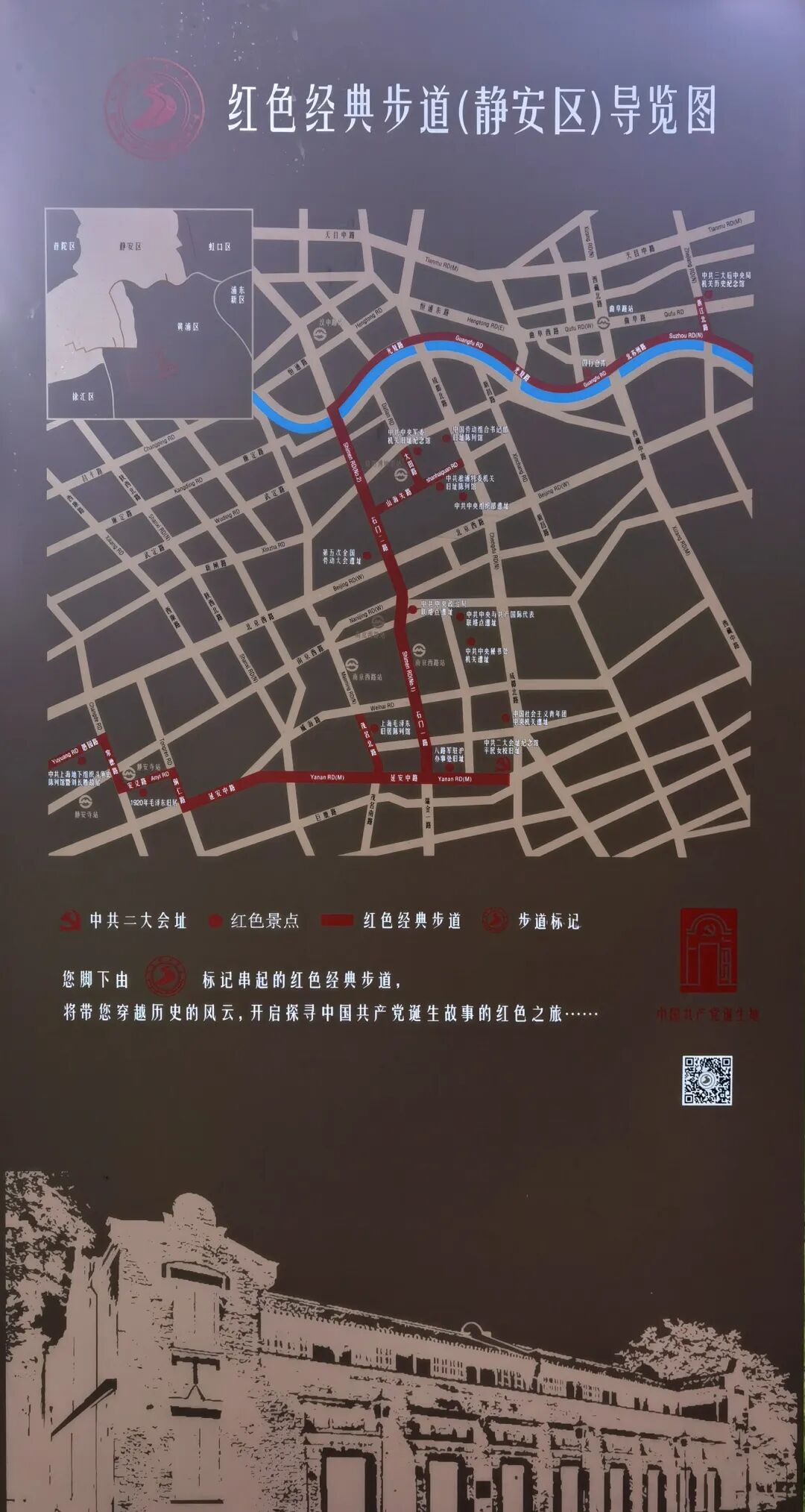 黄色经典之作小径徐汇段以中共二大会址纪念馆作为起点,按照两岸三线(两岸:苏州河两岸;三线:西线、北线、东线)构建了三条小径游线。