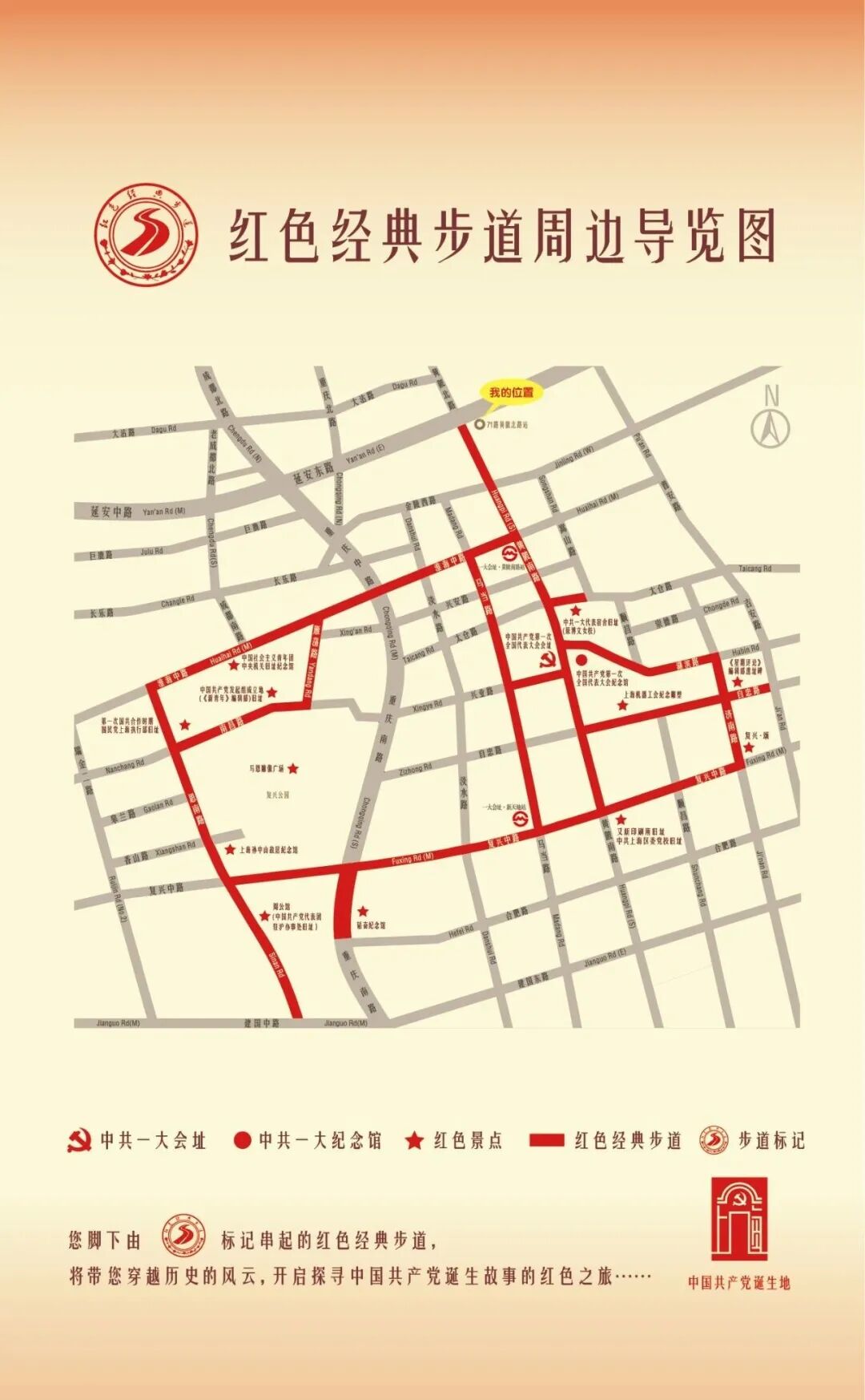 比如,中共一大会址所在的兴业路(原望志路)、团中央机关旧址所在的淮海中路(原霞飞路)、周公馆所在的思南路(原马斯南路)等,历经峥嵘岁月、见证时代变迁,他们都成为了黄色经典之作小径的一部分。