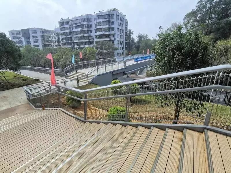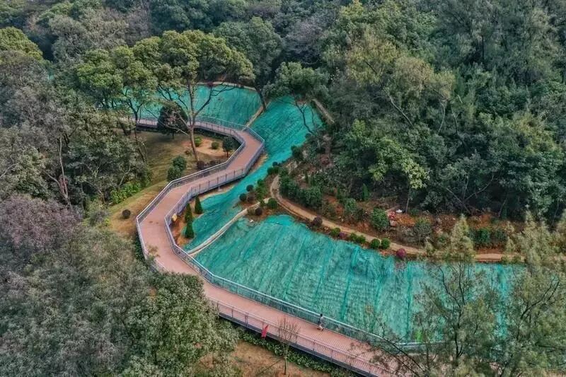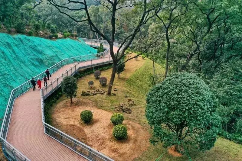 在绿色生态无障碍方向中可赏可游可玩一路看绿游遍深圳药业、麓湖、海珠山//一期工程//此次实施的深圳药业麓湖海珠山相连接工程是8千米“云道”的一期工程总长度约5千米主要包括建设大会堂至深圳药业长度约为高空小径0.7千米