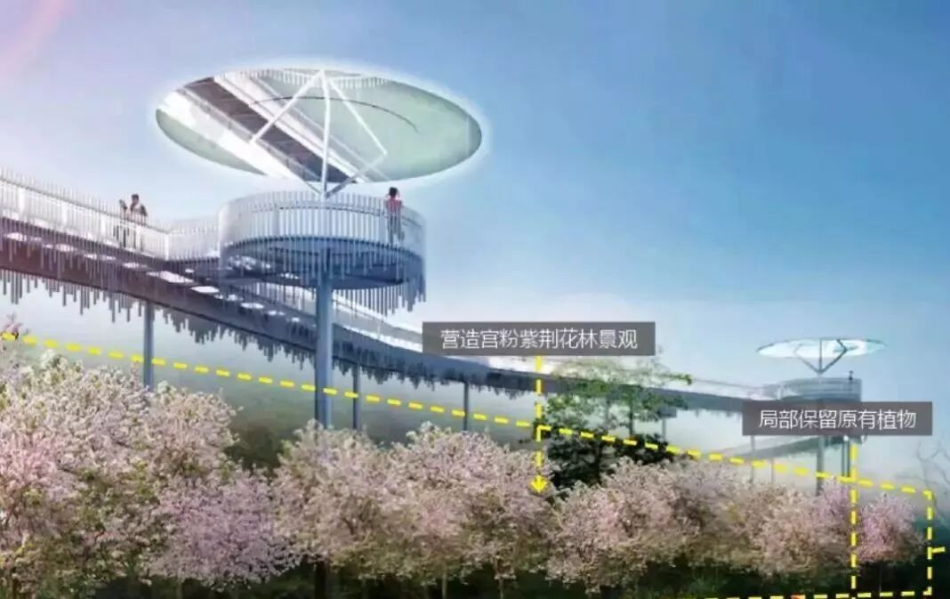 一期“云道”未来将有4个供行人上下的平台,针对平台周边城市绿化自然景观改造提升,增加开花树种、配套设施等,营造良好的环境氛围,打造出自然景观迷人、亮点突出的特色游憩廊道。