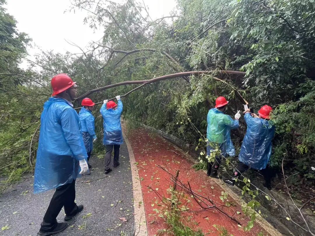 在保证安全的前提下,全力清理路面积存雨水和垃圾,清理落叶以及沙井口周边的垃圾杂物,保证排水通畅;并及时清运垃圾,避免次生灾害发生,保证风景区卫生干净03清除安全隐患 恢复恒定园区通达争分夺秒积极主动开展清理路障、修复设施、摸查隐患点位设置安全标识、搞好游客安全管控。