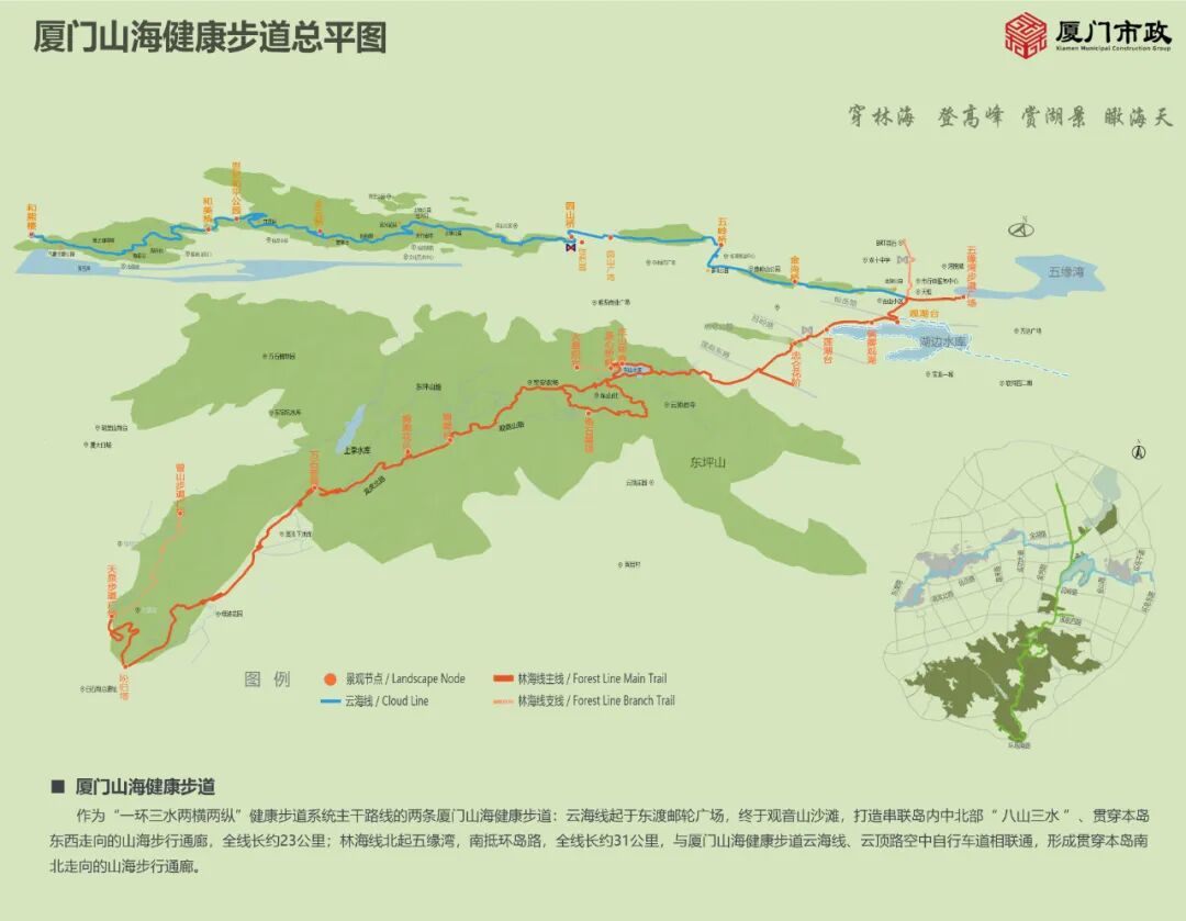 作为福州岛“劳特尔清远两横两纵”身心健康小径控制系统的重要重要组成部分,福州钟山身心健康小径雪松线北起五缘湾,周边经过东山、河边水电站、忠仑森林公园、果园乡山、北山水电站、上李水电站,果园乡社、北山社、南抵沈家门,双线全长约31千米,与福州钟山身心健康小径朝霞线、丽晶路高空步道互相中国联通,形成集自然生态明显改善、文化展现、消闲健身活动、观景台旅游观光机能于多机能的小径控制系统,打造出城市绿色自然生态对外开放内部空间和永达路公交控制系统并重的室外消闲内部空间。