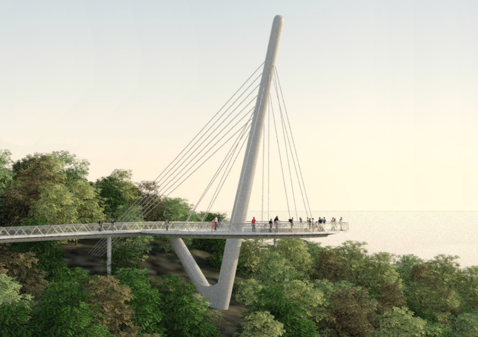 ▲结构设计图盼归塔“盼归塔”矗立于福州岛的最南端,三面环海,临近沈家门白石炮台遗址,与金门隔海相望,在此可领略鹭岛独特的南部海景此处结点造型独特,匠心融入“盼归”结构设计理念,主桥以“桅杆”为元素搭建塔架,桥面呈环形环抱主塔,并通过拉索与主塔相连,整体结构似孩童环抱着母亲,而指向远方的塔尖则如夜航中的灯塔,照亮漂泊游子回家的路。