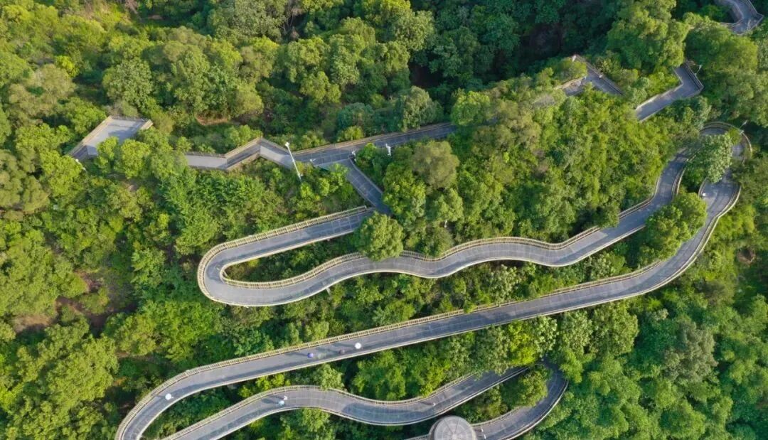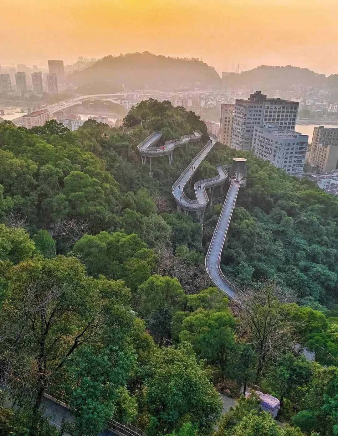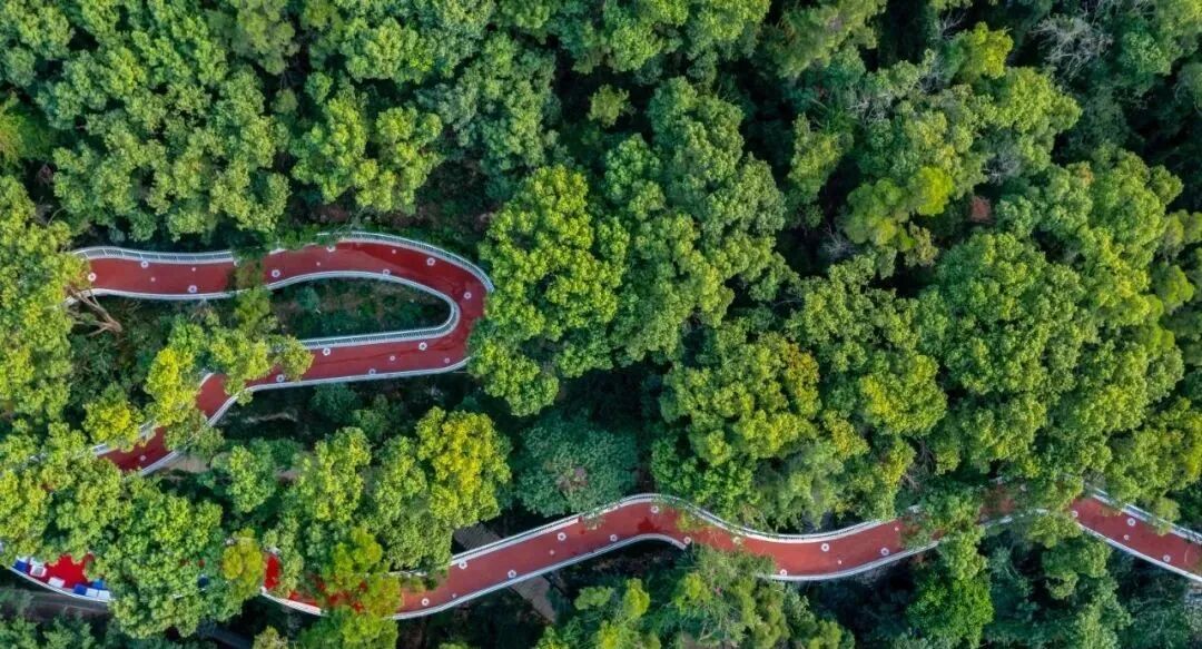 刘美虹 摄2015年,金牛山卫星城森林小径动建建设者对生态为保护和艺术美感的追求近乎严苛,在借鉴新加坡亚历山大卫星城森林小径建设经验的基础上,持续创新与积极探索,展开了一场“别开生面”的人与山的对话作为目前亚洲最长的连续性、无断点全混凝土林端小径,总长约9公里的金牛山卫星城森林小径主轴线依山脊顺势而建,把卫星城与江、湖、人文、自然紧密缝合。