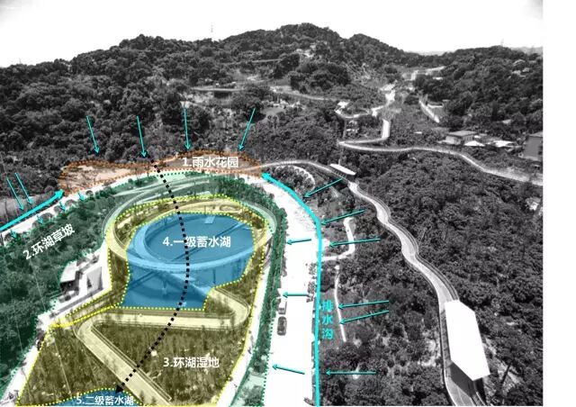 位于锦利中段的梅峰山地丛林公园就是我的大招!这里有很多小水潭,可别小看它们,降雨时可以对雨水进行滞留和汇集,并通过湿地、旱溪将收集到的雨水层层截留过滤,最终汇入蓄水湖暴雨来临前,还可以提前降低蓄水湖的水位,容纳更多雨水。