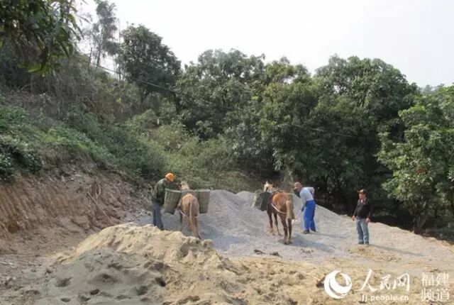 点点驮上去的!对的,就是骡子,这种最原始的工具。这些骡子是从四川买来的,一匹要1万多元,一匹骡子一天驮的砂石有300多斤重,要来回15趟左右才能驮完。