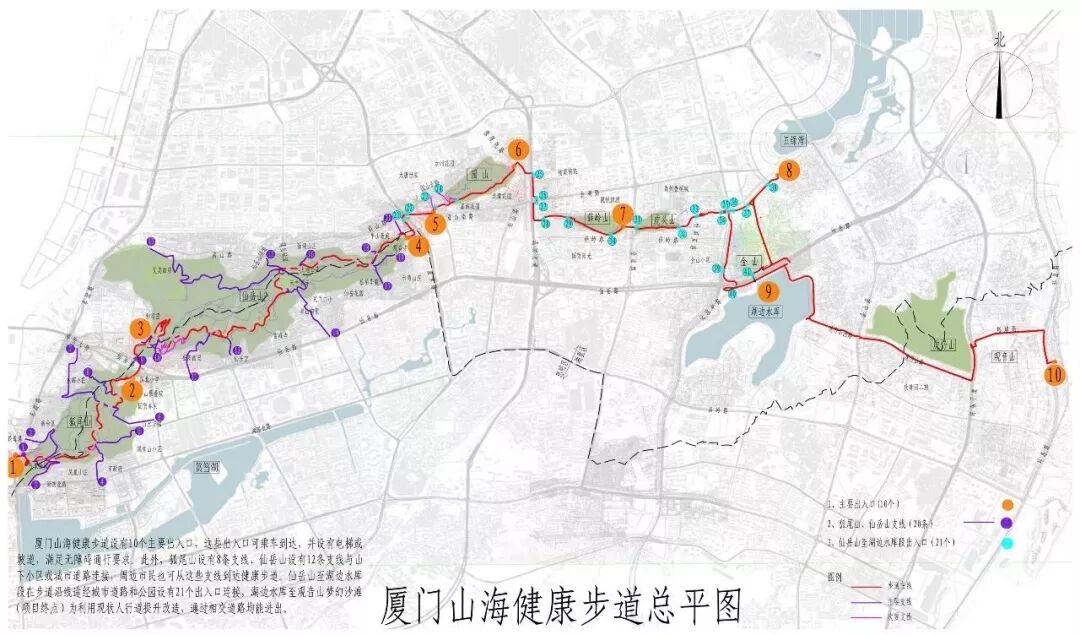 据福州钟山身心健康小径官方APP显示,整条小径沿线检票口被分为三个等级,主要检票口为一级,支线检票口为二级,沿线较小的检票口为三级。其中,一级检票口有10个。