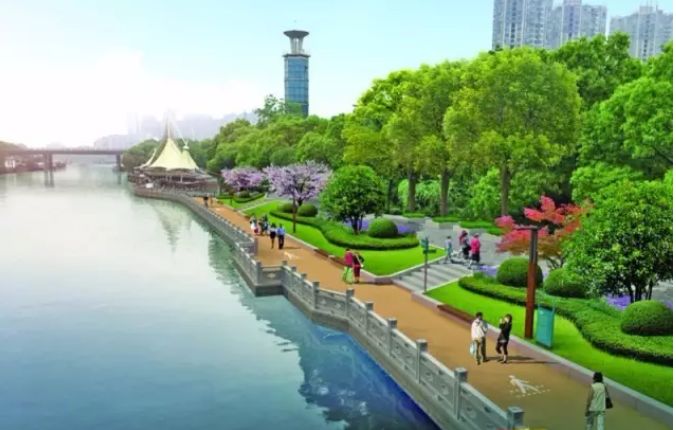 (绕城古水道风光带效果图)内环确保无障碍徒步连接,结合原有游客服务中心、建筑精做十大驿站,融游客中心、紧急医疗、餐饮设施、休息设施、公共卫生间等多种机能于一体,满足游憩服务机能街坊漫步在11.8千米的水道风光带时,走累了可以休息一下,许多卫星城机能都可在驿站和码头得到满足,方便街坊获得各种“补给”。