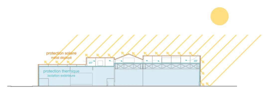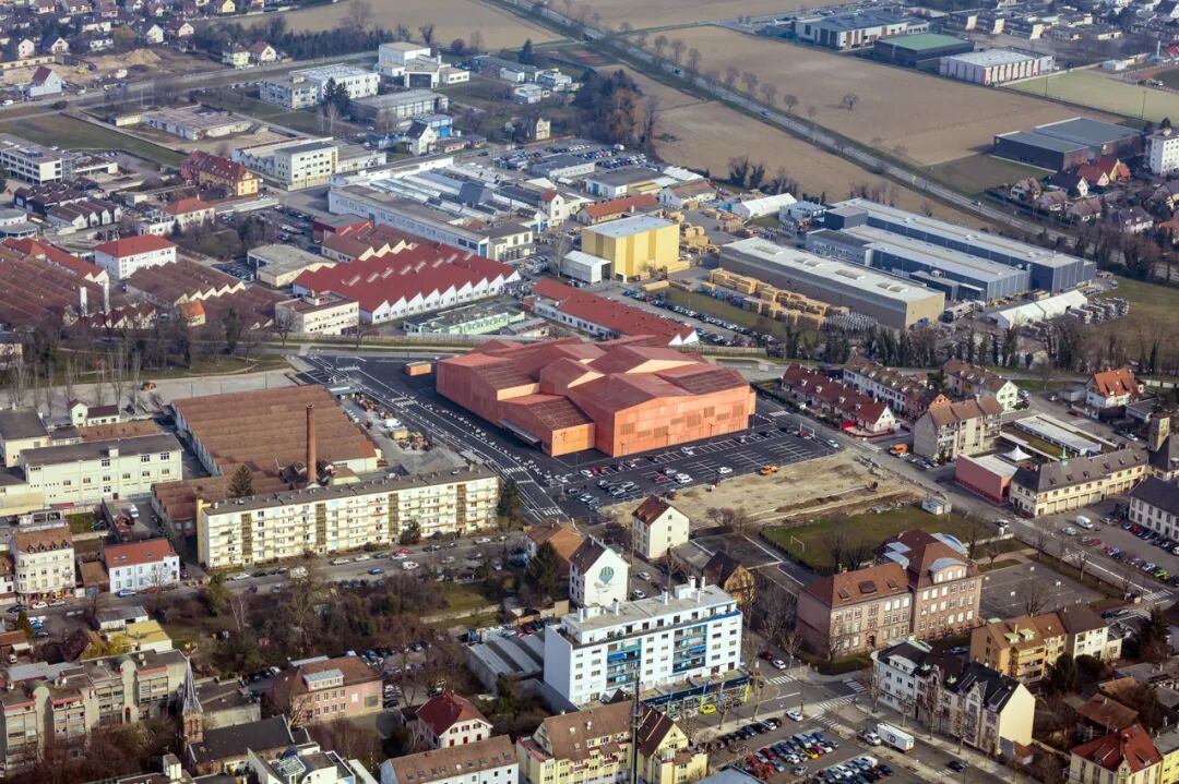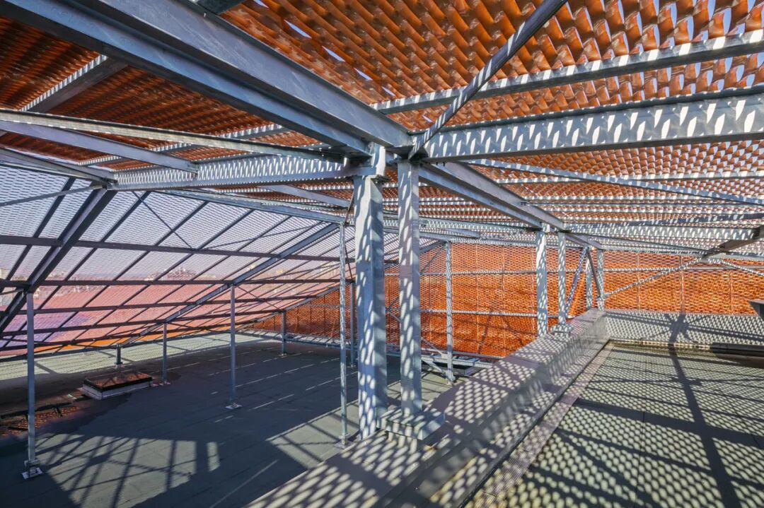 表皮结构设计的灵感来源于周遭建筑物区残留的岁月痕迹:波浪般延绵的橙色瓦顶中不时有饱含沧桑的工业烟囱破面而出。