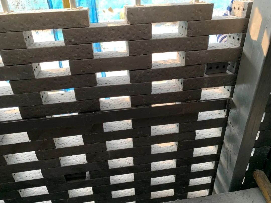 中空陶砖幕墙为了实现镂空砌筑的结构设计采取了穿筋幕墙体系块砖都是通过砖内的孔用竖向钢筋串起来砖之间由垫片隔离保持缝隙