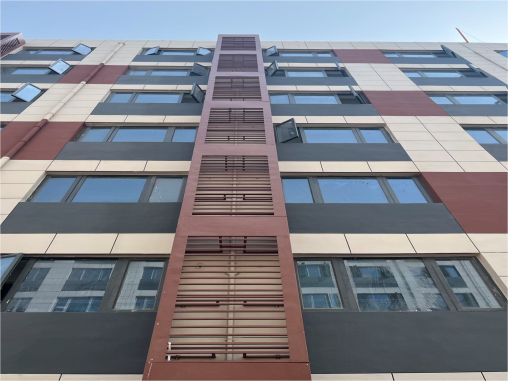 外墙空调板隔墙强化为铝格栅隔断,现浇混凝土空调板强化为成品空调格栅,工厂定型化研磨,现场工程建设施工便捷,有效提高工程建设施工工作效率,并节约混凝土、模板等金属材料使用量同时,工程建设施工过程中力推使用装配式、定型化、控制技术标准金属材料透过采用工程建设施工高架道路永临结合、地板砖提前排版、玻璃钢地砖、模板拼接等控制技术减少建筑垃圾产生,达到减少环境污染、循环利用的效用。