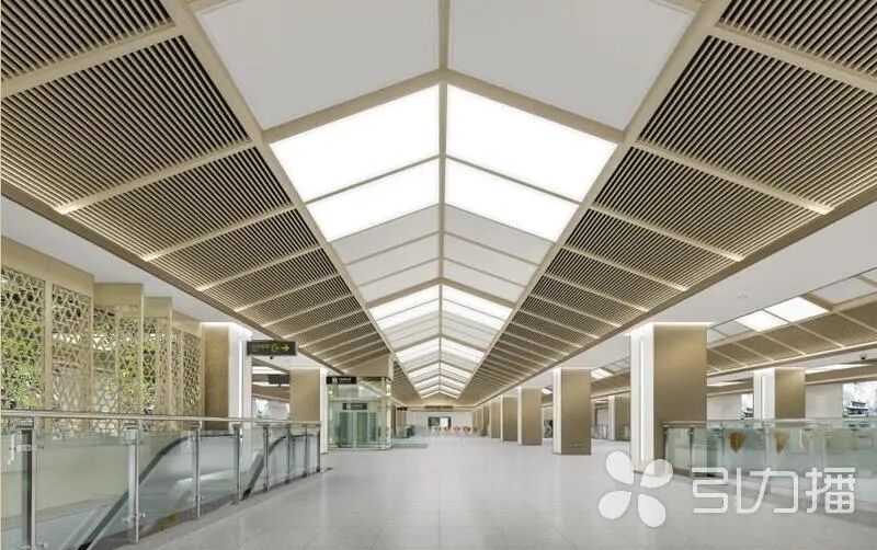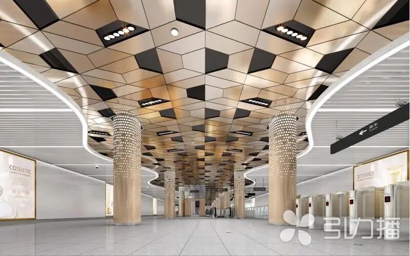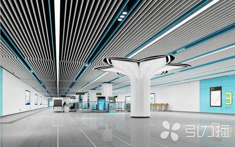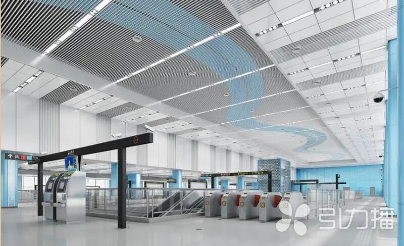 中新大道西站以站点周边林立的当代化智造企业为结构设计源起,“科技矩阵”是此站的结构设计理念方形连贯的造型诠释了数字世界中的“严谨”“理性”;深色裸顶上配以不规则的条形铝格栅,如星轨穿梭,透过“天窗”引入室内,形成现在与今后的时空交互。
