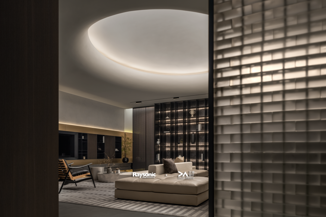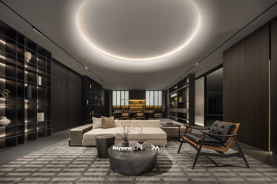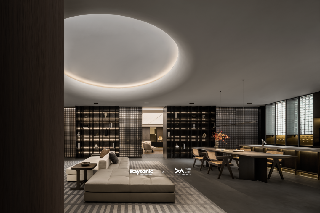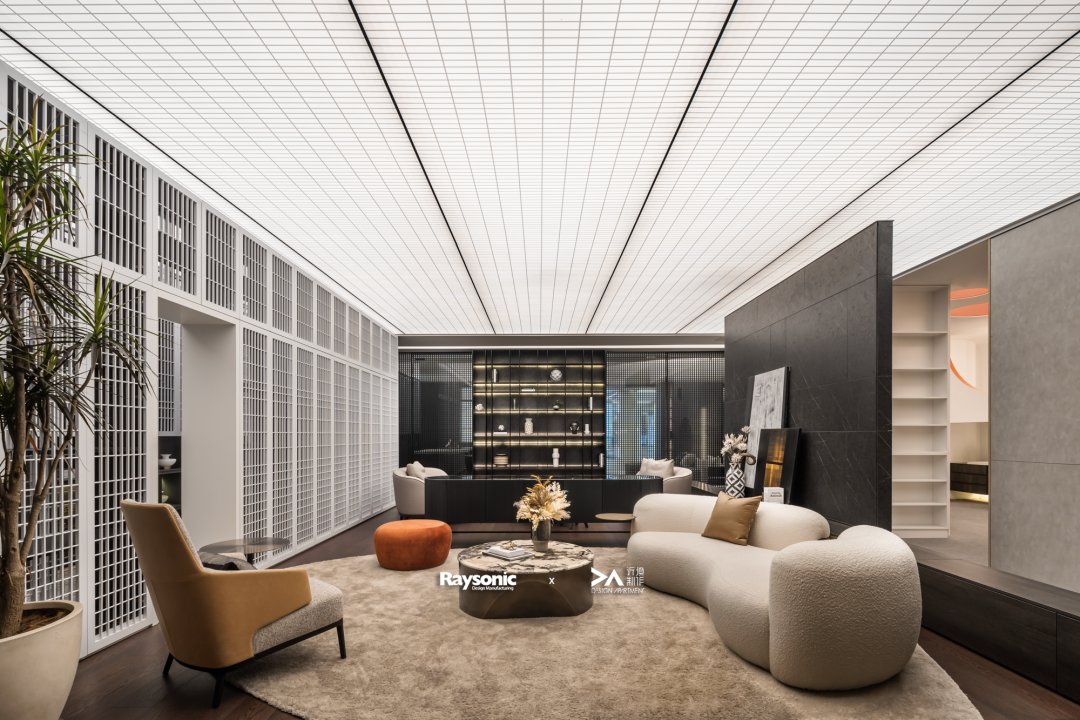 903煙燻橡木、BR05香檳金、鐵藝、鋁板櫃▲以圓弧形天花,搭配以幾何方塊組合的方形沙發,天圓地方的大器氣場揭開Raysonic苏州展廳的視覺饗宴。