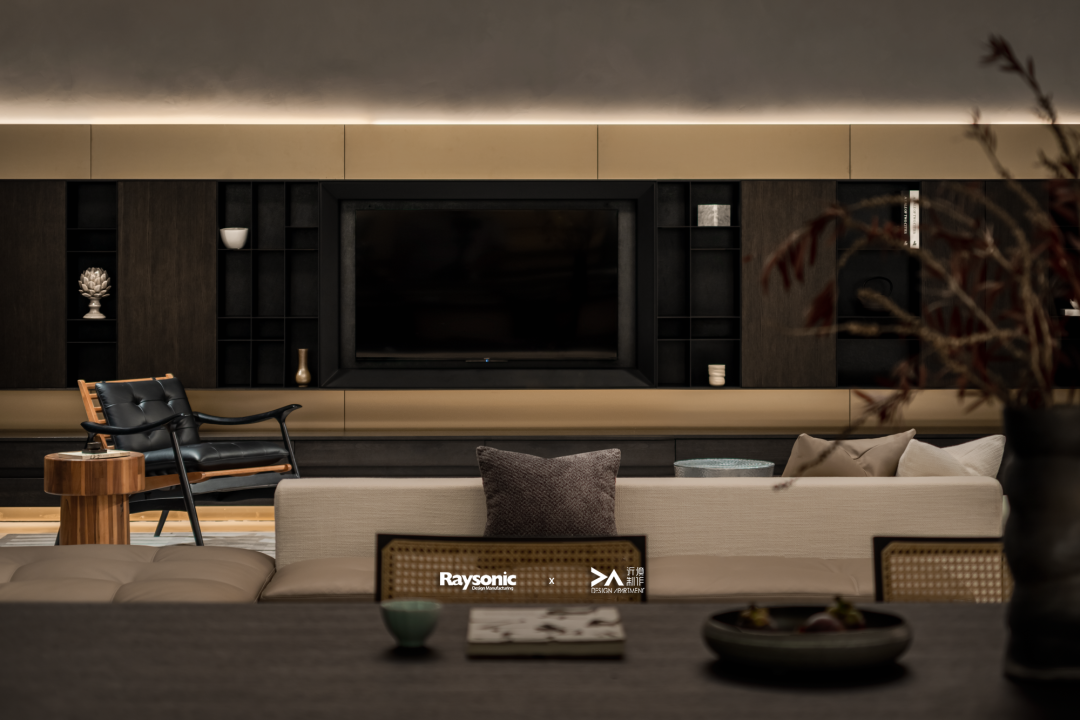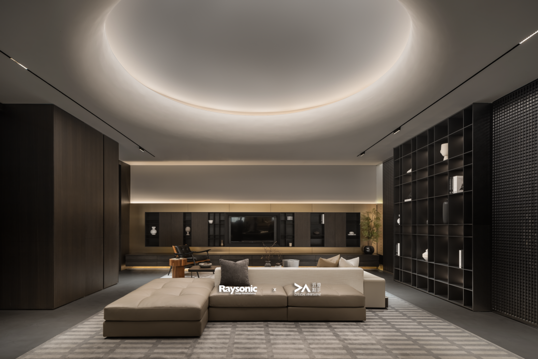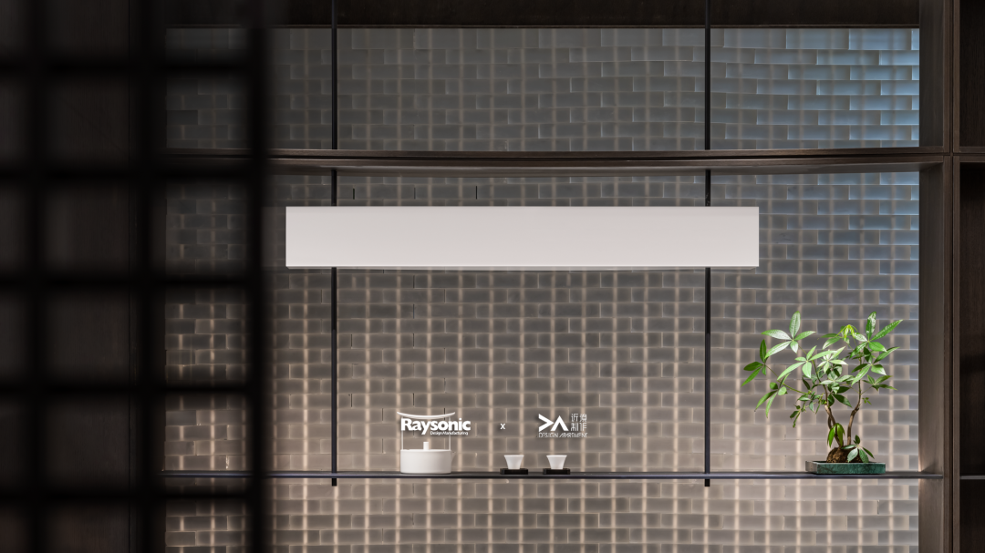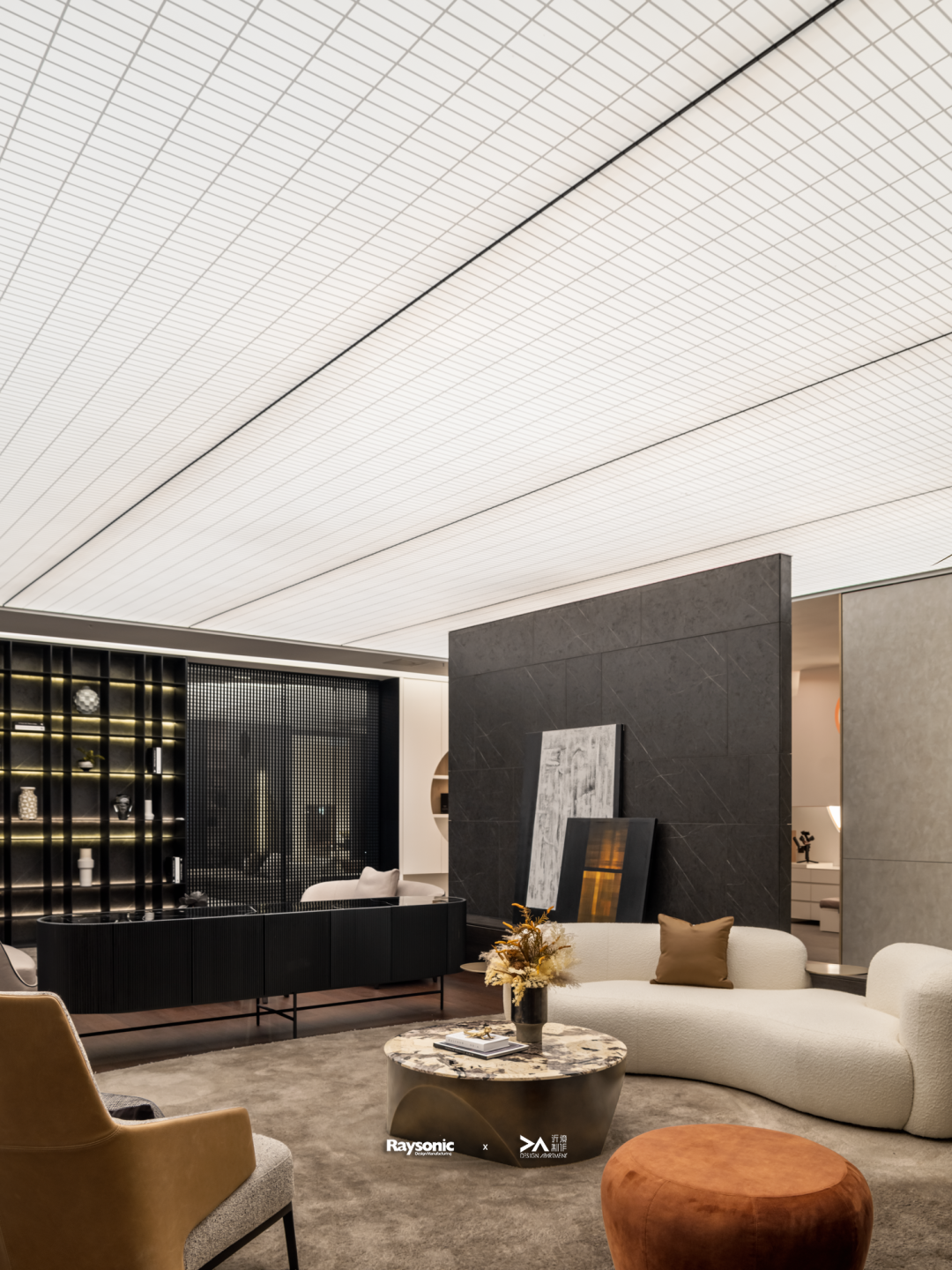 903煙燻橡木、BR05香檳金、鐵藝、鋁板櫃▲以圓弧形天花,搭配以幾何方塊組合的方形沙發,天圓地方的大器氣場揭開Raysonic苏州展廳的視覺饗宴。