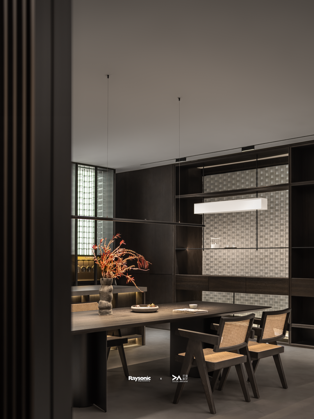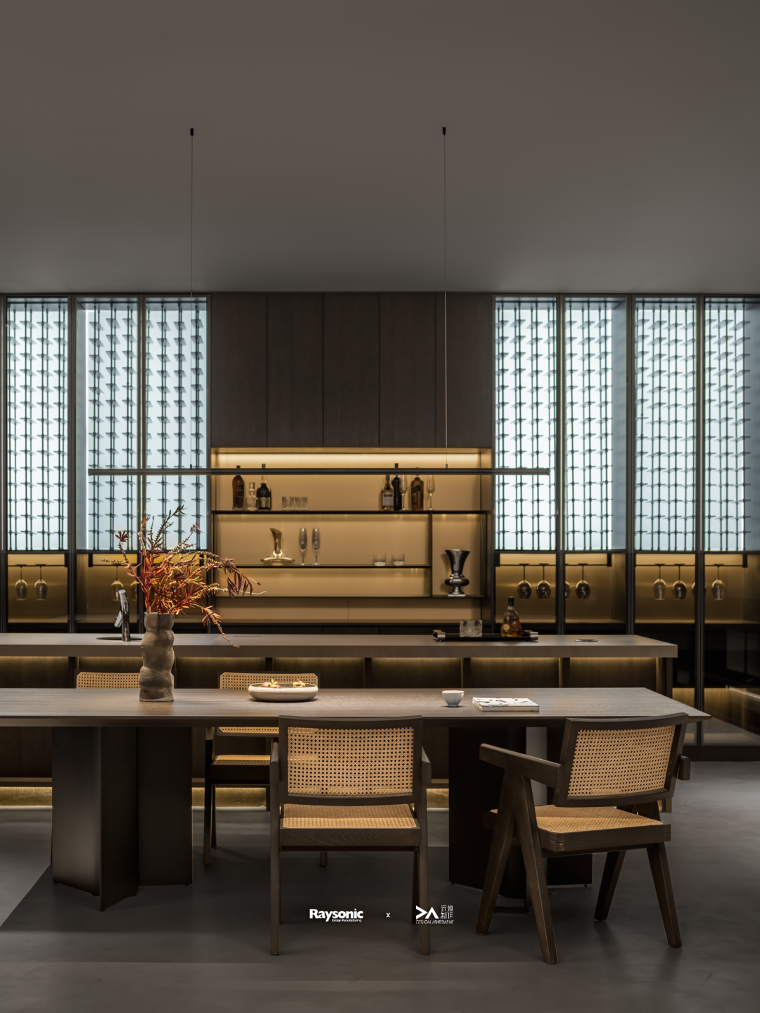 903煙燻橡木、BR05香檳金、鐵藝、鋁板櫃▲大片的發光雲石和玻璃磚將Raysonic材質維度推向更為廣闊的境地,現代的手法語彙,細膩的細節介入,賦予空間以風格鮮明的時代特色。