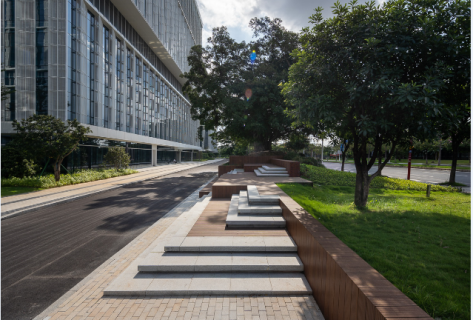 南面入口附近保留原有的榕树,逐层抬升地坪,形成休闲的榕树休闲广场,保持原有地貌的记忆