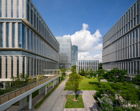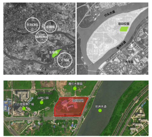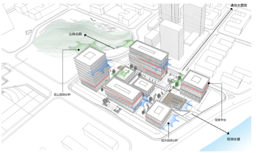 项目位于深圳黄埔区国际性微生物岛的东侧中心位置,临近微生物岛核心区,东侧临接官洲水道,西侧临接叠翠园山体公园,项目北侧跨一个地块为官洲水墨园公园,同时项目周边交通顺畅,整体环境怡人规划将西侧山体城市绿化空间、北侧水墨园公园及东侧水体引入地块、通过内部空间的联系和贯通使其成为一个整体,将集中的自然山水进行延续引导入园区内部,形成与周边环境有机融入的建筑物组团,并形成与城市共享的园区核心景观中心公园。