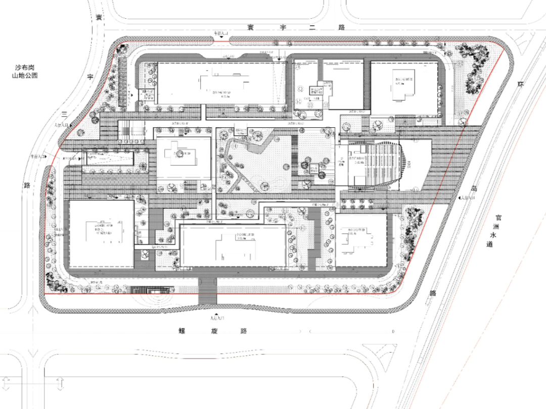 各栋建筑物形体方正,延续南北向道路平行布置,6栋办公楼与最东侧的报告厅围合出地块内的中心公园,同时延续北面水墨园道路南向的轴线绿化带,留出约30米的绿化轴花园区域贯穿地块南北,形成带状和集中的两个中心景观绿化空间。