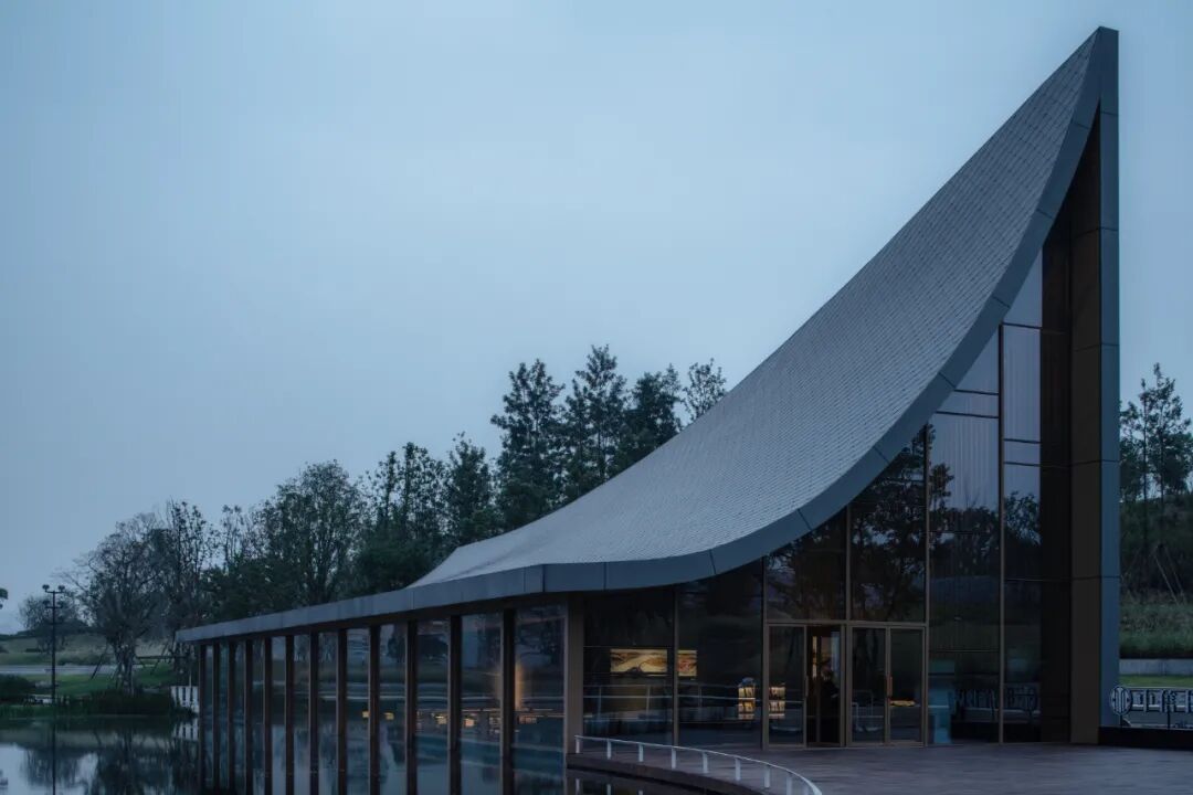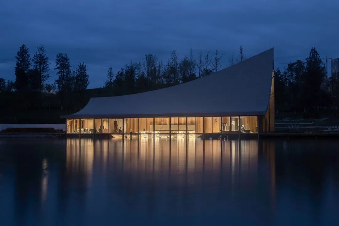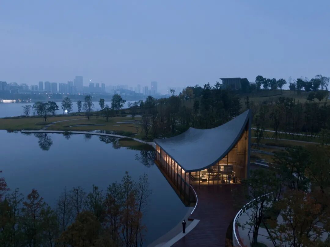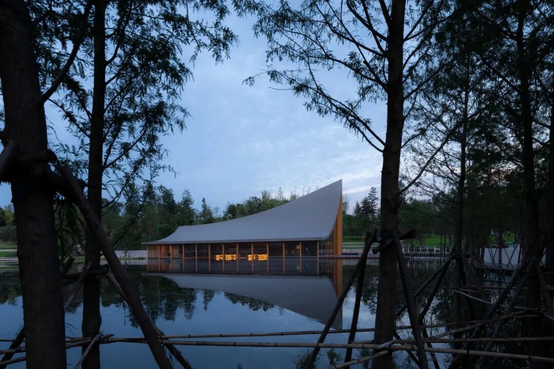 ©存有建筑物Arch-Exist屋顶的曲面与湖面的水纹形成恰到好处的呼应,微风吹过,湖面上荡漾着的涟漪,乘风延展至屋顶,形成轻盈的屋面,与东兴湖森林公园的自然生态融为一体。
