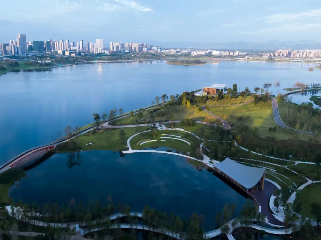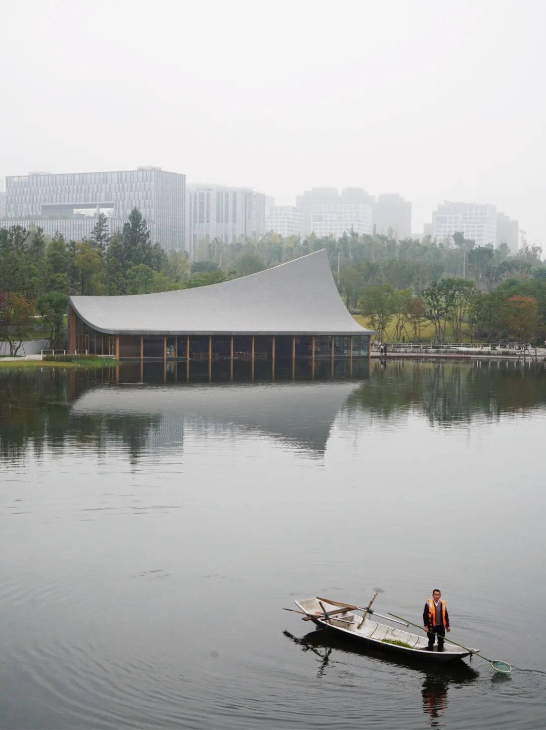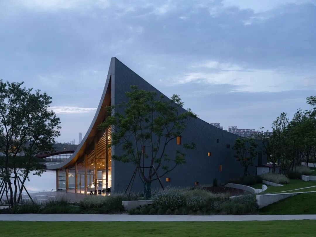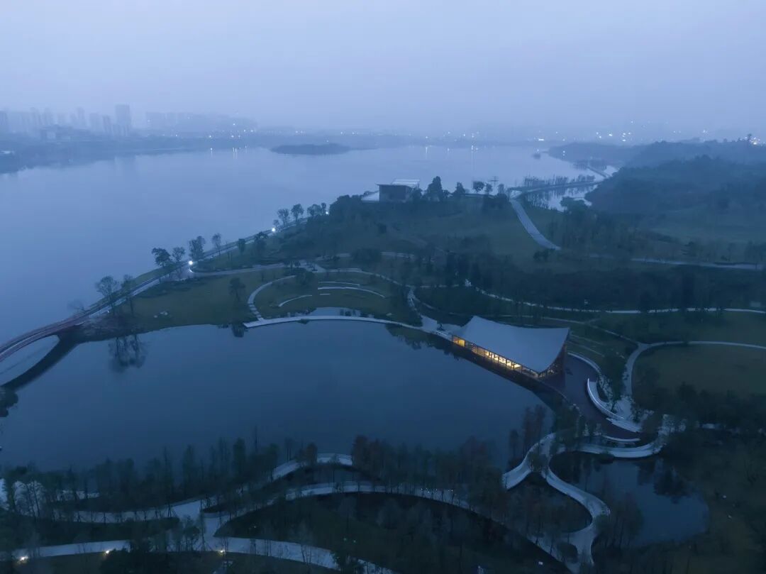 ©存有建筑物Arch-Exist屋顶的曲面与湖面的水纹形成恰到好处的呼应,微风吹过,湖面上荡漾着的涟漪,乘风延展至屋顶,形成轻盈的屋面,与东兴湖森林公园的自然生态融为一体。